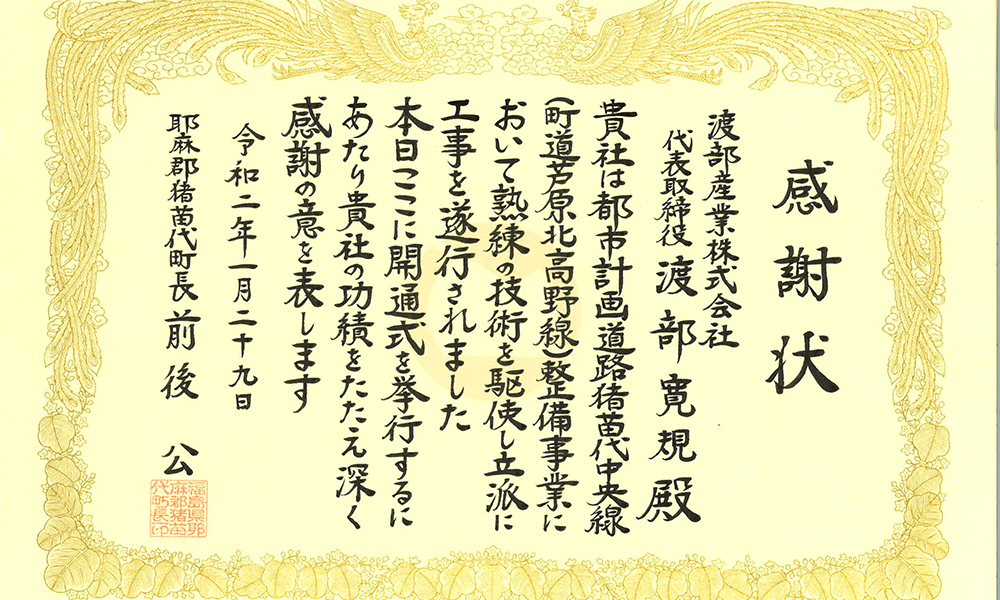 このたび弊社は、「都市計画道路橋芹代中央線・町道芳原北高野線整備事業」において、優れた技術と真摯な施工が評価され、猪苗代町より感謝状を頂戴いたしました。
