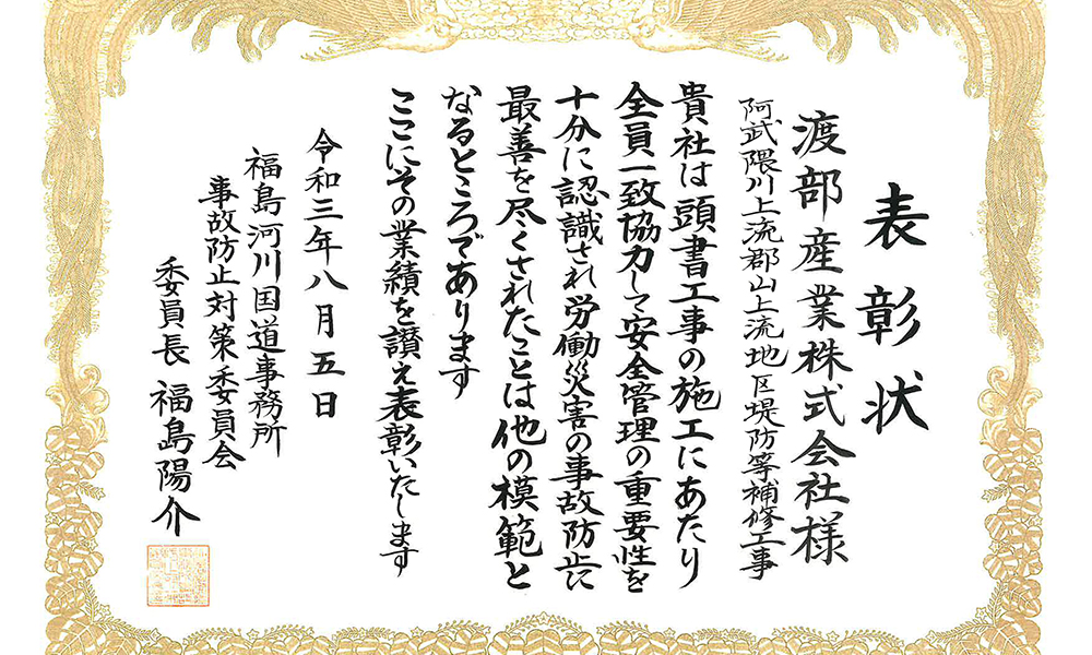 このたび弊社は、令和3年8月5日「阿武隈川上流郡山上流地区堤防等補修工事」において、労働災害防止に対する取り組みが評価され、表彰を受けました。