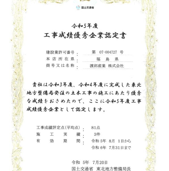 令和5年7月20日、国土交通省 東北地方整備局より、令和5年度「工事成績優秀企業」として認定されました。