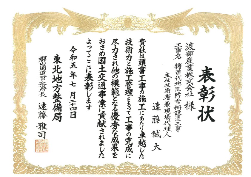 東北地方整備局郡山国道事務所発注の「猪苗代地区防雪柵設置工事」において、優良工事として表彰をいただきました。この受賞は、日頃よりご協力いただいている地域の皆様、関係各位のご支援の賜物です。今後も培った技術と経験を活かし、安全で高品質な施工を通じて、地域社会の発展に貢献してまいります。