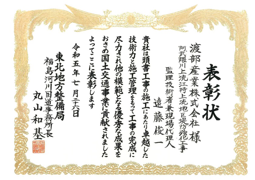 令和5年7月 東北地方整備局より優良工事表彰(事務所長表彰)を賜りました。
