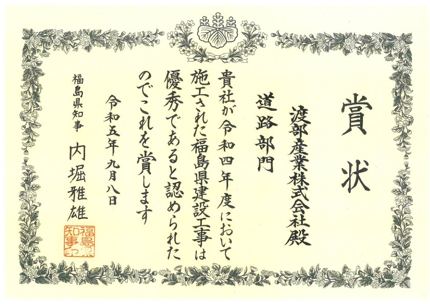 福島県発注の「地域づくり交流促(交付)工事(道路改良)」において、優良工事として表彰をいただきました。この受賞は、日頃よりご協力いただいている地域の皆様、関係各位のご支援の賜物です。今後も培った技術と経験を活かし、安全で高品質な施工を通じて、地域社会の発展に貢献してまいります。