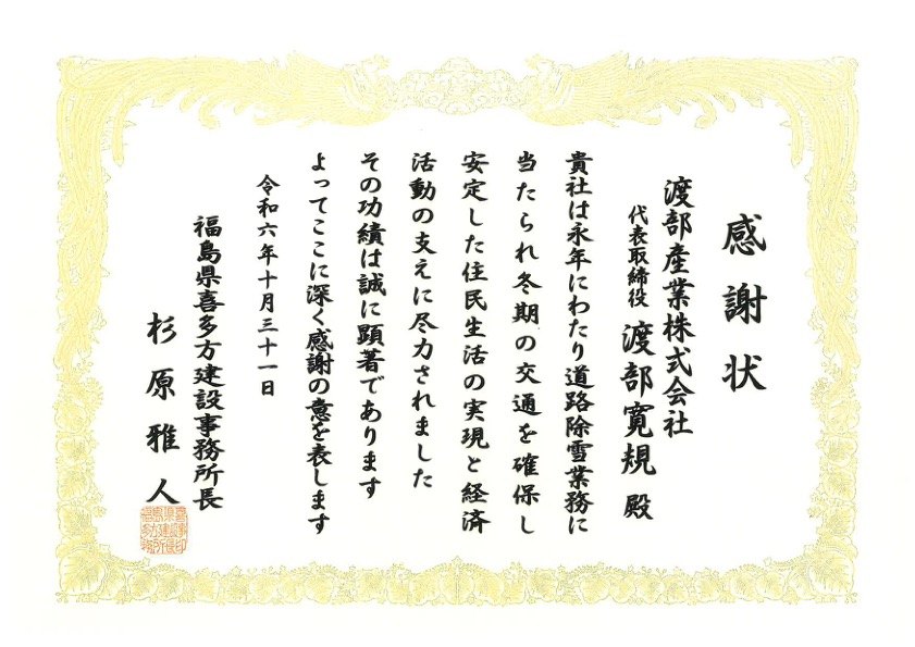 このたび、弊社は令和6年10月31日、福島県喜多方事務所より道路除雪業務に対して感謝状を賜りました。