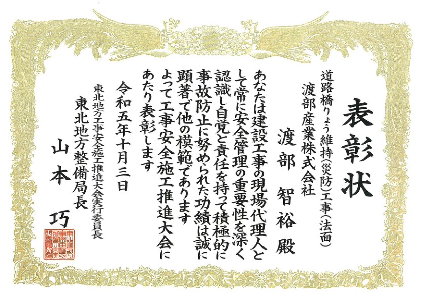 関係者への指導や現場環境の整備など、安全施工に尽力。事故の未然防止に大きく貢献したことが高く評価されました。